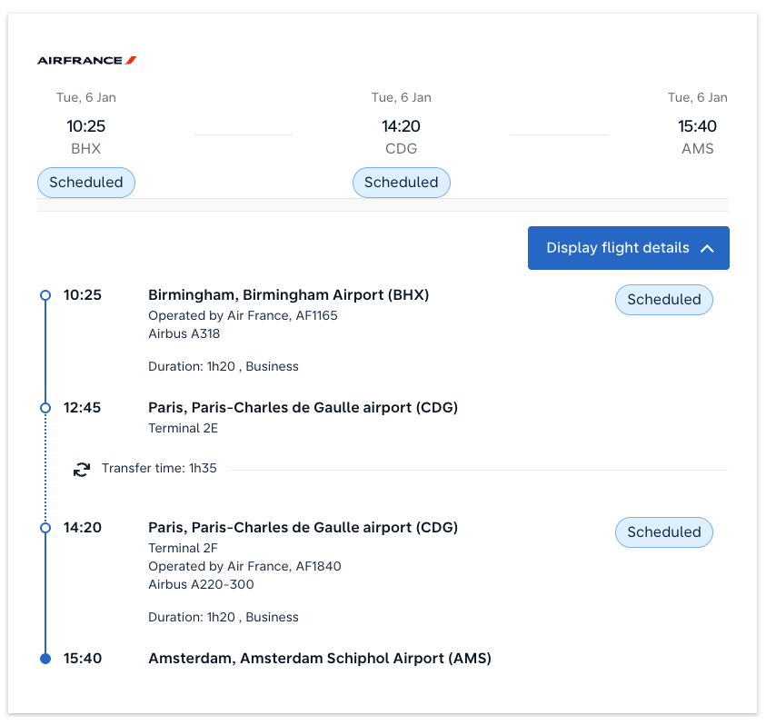 I was due to fly with my son to Amsterdam on 6th Jan 2026. We were leaving from Birmingham for out first flight to Paris at 10:25 a.m. Out itinerary was BHX-CDG followed by CDG-AMS arriving mid afternoon. We were due to travel in European Business class with Air France. I’d booked tickets using Virgin Atlantic points – very good value and I have FB Gold Status so it would give him a taste of the same benefits on this flight.