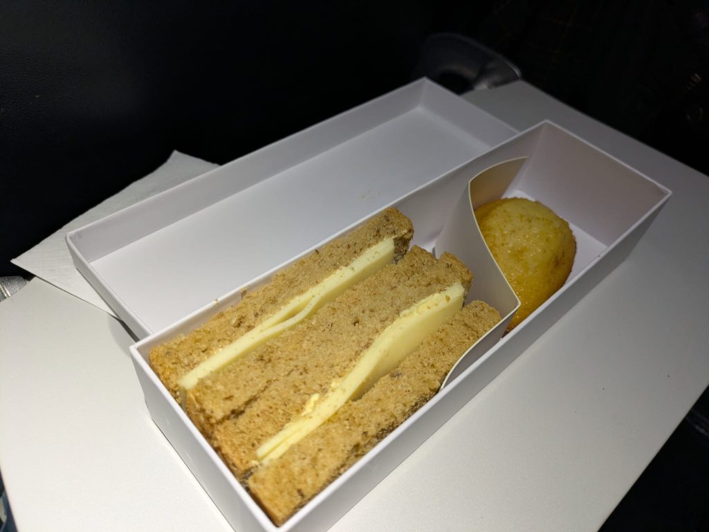 A cheese sandwich. Not a problem because I ate in the lounge and the coffee was good.